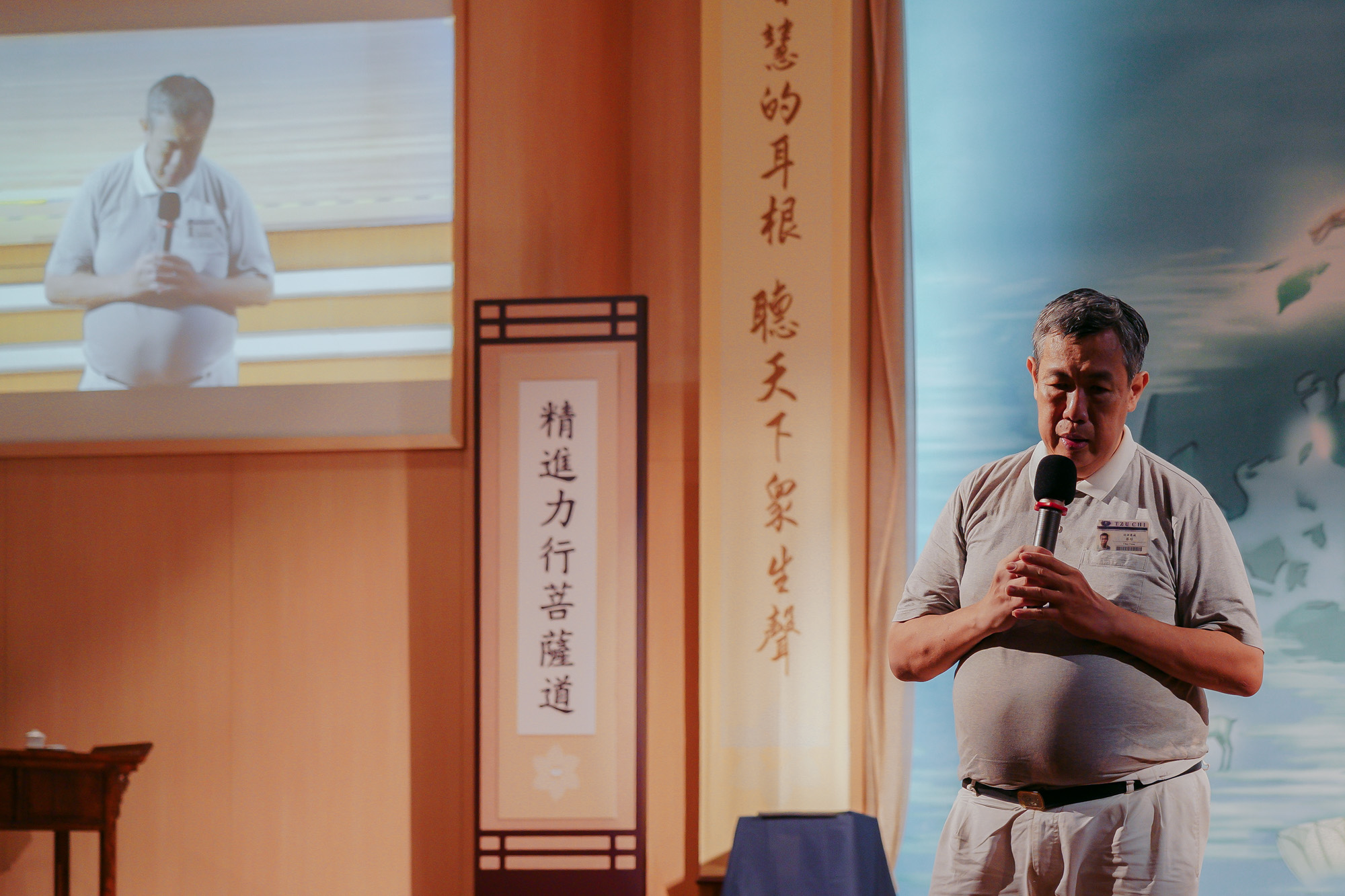 志工们轮流上台分享自己与慈济的因缘。志工陈福龙表示,由于身为德士司机,疫情期间无法工作,在家中观看大爱电视台时,被证严上人和慈济人的故事感动,萌生加入慈济的念头。之后在开德士时,他总会留意慈济的踪迹。皇天不负有心人,某日,陈福龙终于走入新加坡静思堂,受到值班志工余慧铢和黄莉燕接引,从而开始他的慈济旅途。